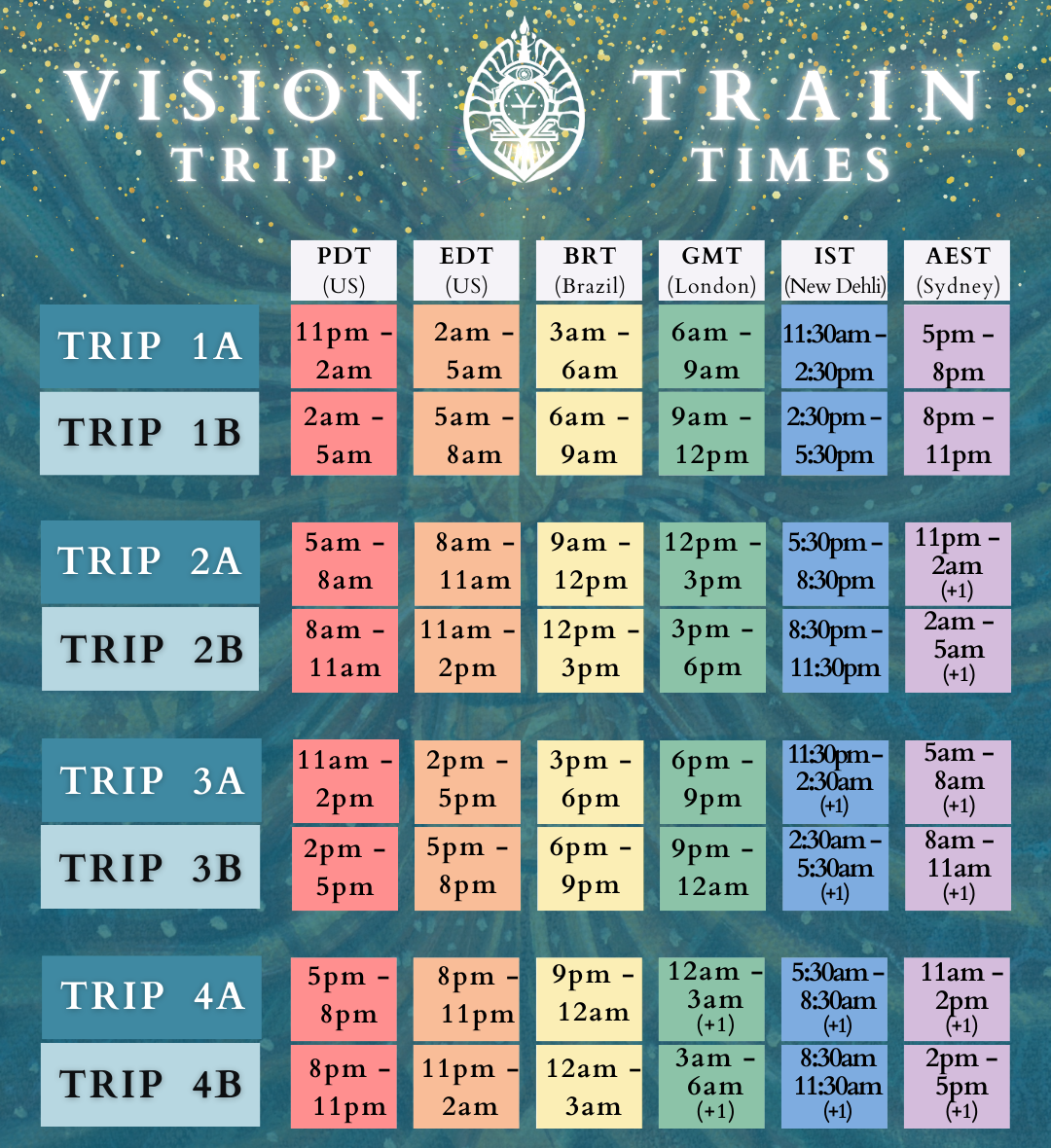 - Mondays - TRIP 4A - 5pm PT / 8pm ET / 10am AEST +1